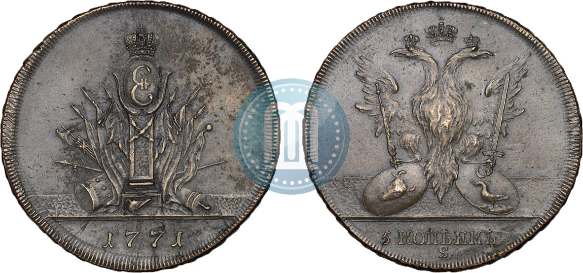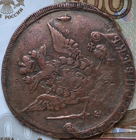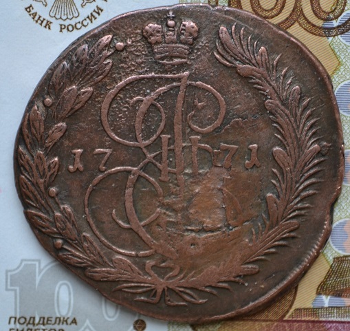 Всем привет. Имею подозрения на перечекан с 5 копеек 1771 для молдавии и валлахии. По факту 30 грамм, схожая насечка по краю и остатки буквы "S". Остальное - субьективно. Хотелось бы услышать другие мнения.