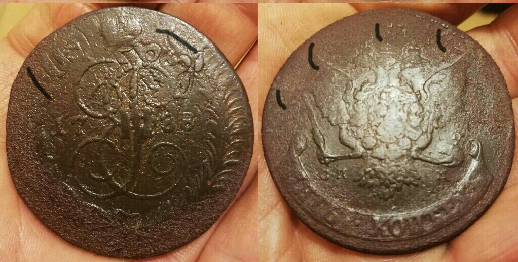 Не вижу слоения металла. При ударе лопатой эти слои выскочить должны в районе удара. Так что не все так просто с этой монетой. Надо подождать вердикта других знающих форумчан.