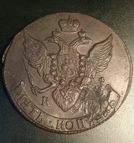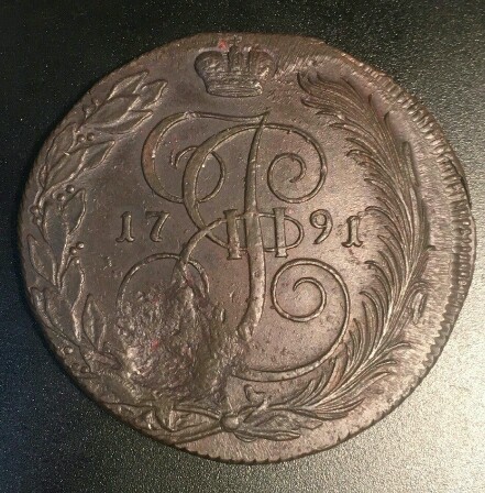 5 копеек 1791 км, уважаемые нумизматы! Подскажите это брак? Засорение штемпеля?