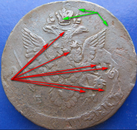 QUOTE(прапорщикъ @ Mar 24 2020, 15:43) Здравствуйте . На сколько я знаю , перечекана в этом (1784г) году не было . Интересная монетка в плане браков . "Мешанина" на орловой стороне получилась из за того , что тиснута монета была штемпелями с холостым соударением . Плюс ко всему штемпеля тиснули дважды ( двойной удар ) . Вот и получилось что видим ... Постарался показать самые яркие следы . Красным - следы ХС , зелёным - следы двойного удара . Вложенные эскизы изображений |