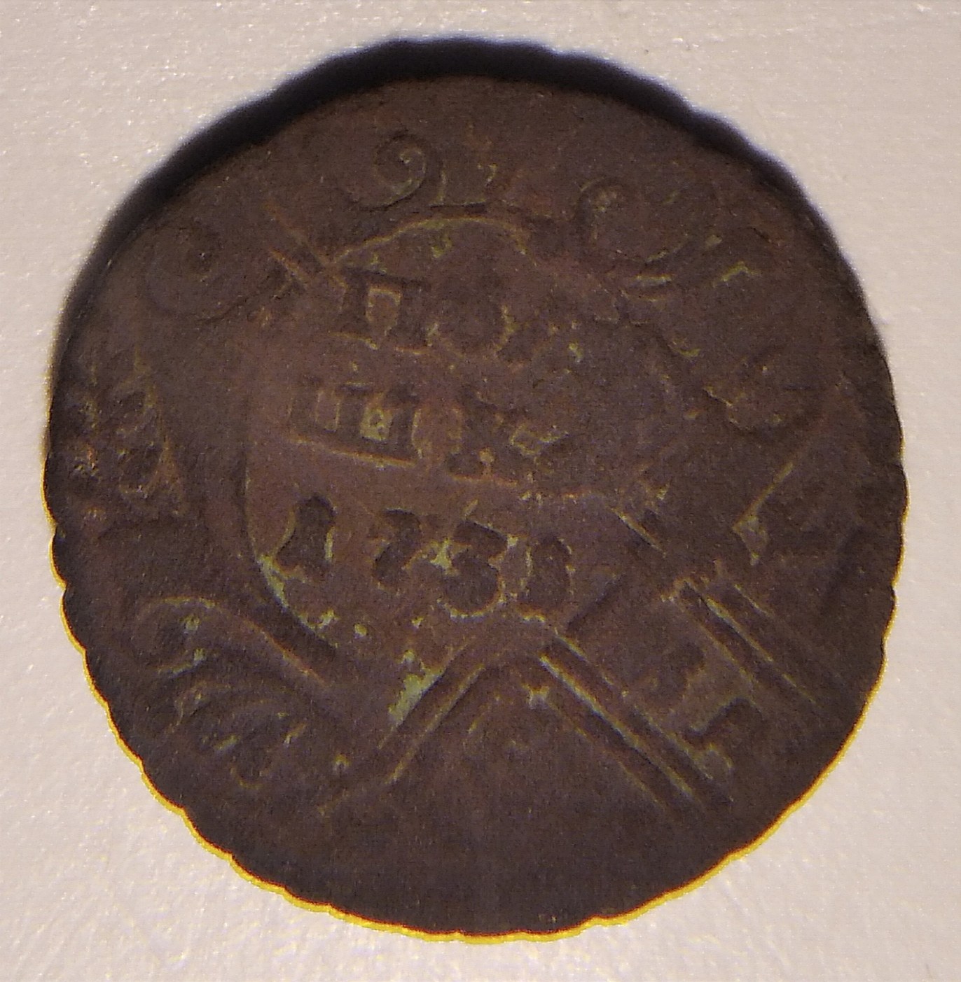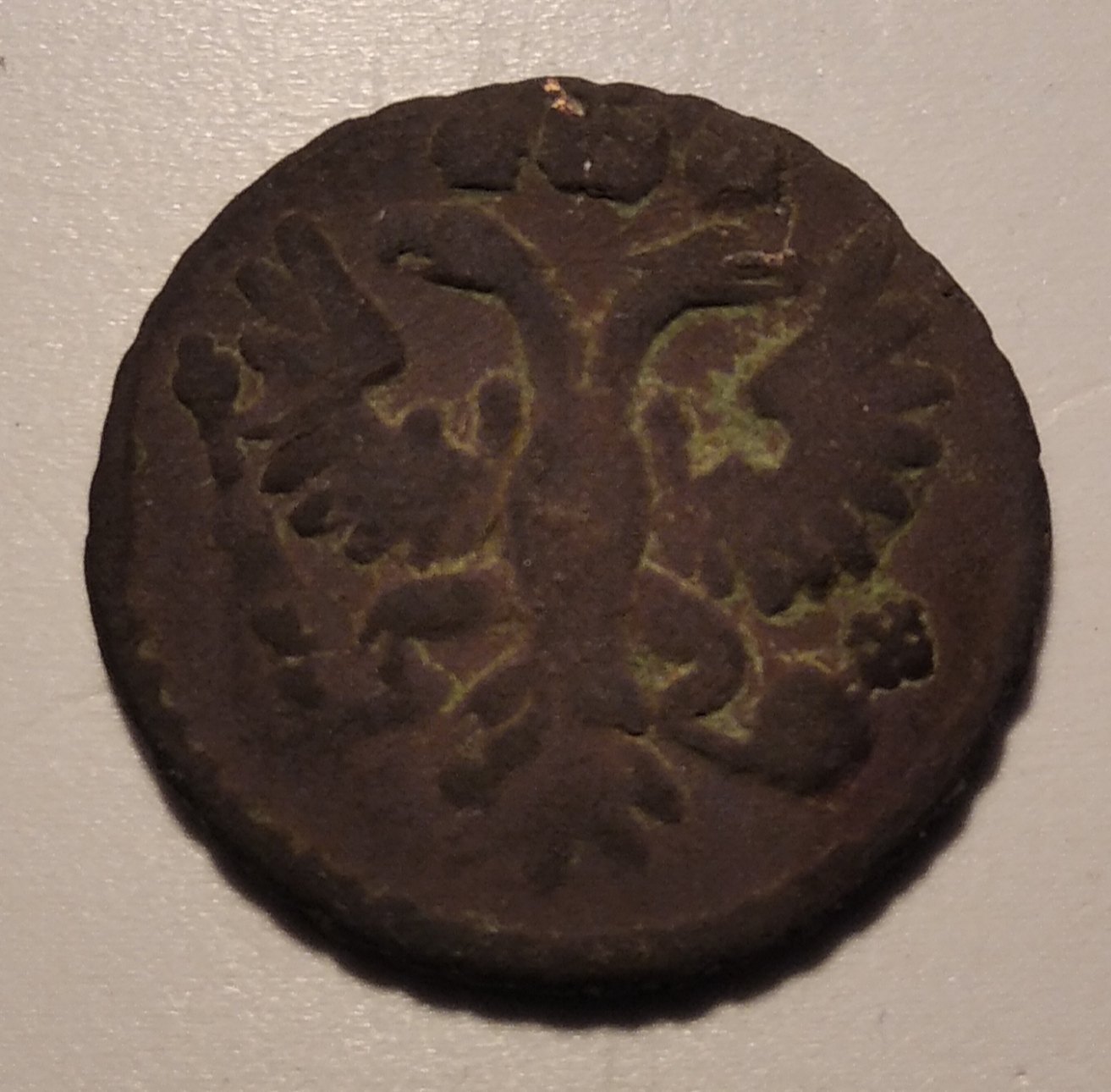 Здравствуйте,подскажите пожалуйста по данной полушке,вроде мне видится перечекан с крестовой монеты..Или я ошибаюсь?