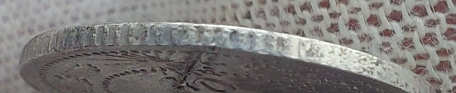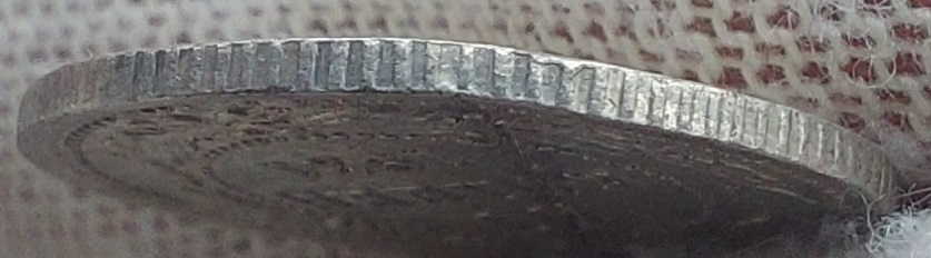 SaM , монетка была гнутая . "Вдавлена" в реверс ( соответственно аверс "выгнут") . Поясню - загиб был не равномерным . Верх ( что по аверсу , что по реверсу ) деформирован сильнее . От этого и следы на канте только там ( на аверсе ) . Фото гурта в показанных местах тоже говорит за это . "Внизу" деформация рифов не различима . А вот "вверху" совсем наоборот . ( не уверен полностью , но возможно , там гурт "подчищался" ) .