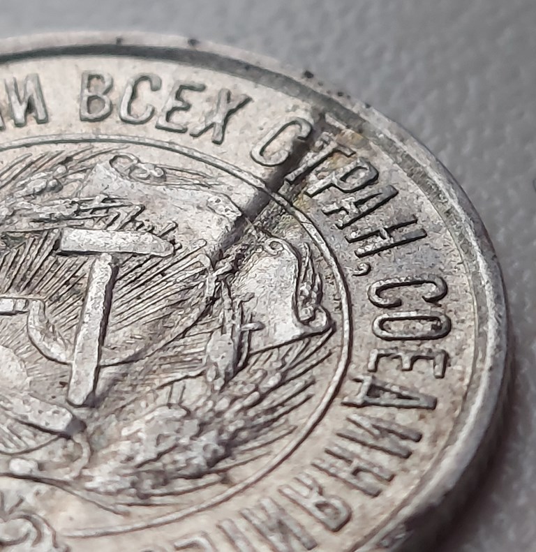 QUOTE(SaM @ Feb 28 2023, 10:48) Тоже так думал, но при более чётком рассмотрении не то пальто. Обратите внимание на кант аверса, он вообще без повреждения. Добавлю ещё то, что с монетой никаких манипуляций не производил, т.е. не правил и т.д. И всё же S.A.Y прав . Вот эта "кривизна" в единице и литере "О" говорит о том , что дефект получен после чеканки . Вложенные эскизы изображений |