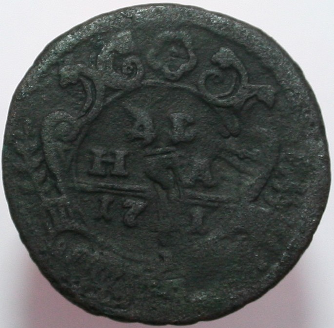 Скорее всего просто перечекан петровской копейки 1704-1718 в денгу.