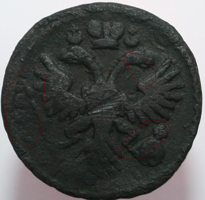 Уважаемые господа, подскажите пожалуйста по данной монете. Нашел у себя денгу 27-28 мм диаметром, как я понимаю 1731 года. Мне кажется просматривается перечекан, возможно двойной перечекан. На реверсе проглядывается силуэт лошади. На том месте, где должна быть буква "Г" похоже как нога, только от лошади или всадника? Еще, на этой ноге есть двойная полоска, возможно от предыдущего перечекана? Внизу, под годом выделяются очертания, похожие на букву "Г", на снимке это плохо выражено получилось (отмечено красным кружком). На аверсе похоже остатки от надписи и какие-то линии, тоже отмечены красным. Так вот, если на реверсе это лошадиная нога, тогда лошадь очень маленькая получается, такая на копейках 1724 года была. Возможно, что копейка была перечеканена сначала в копейку 1724 года, а потом в денгу? Или все это моя бурная фантазия?