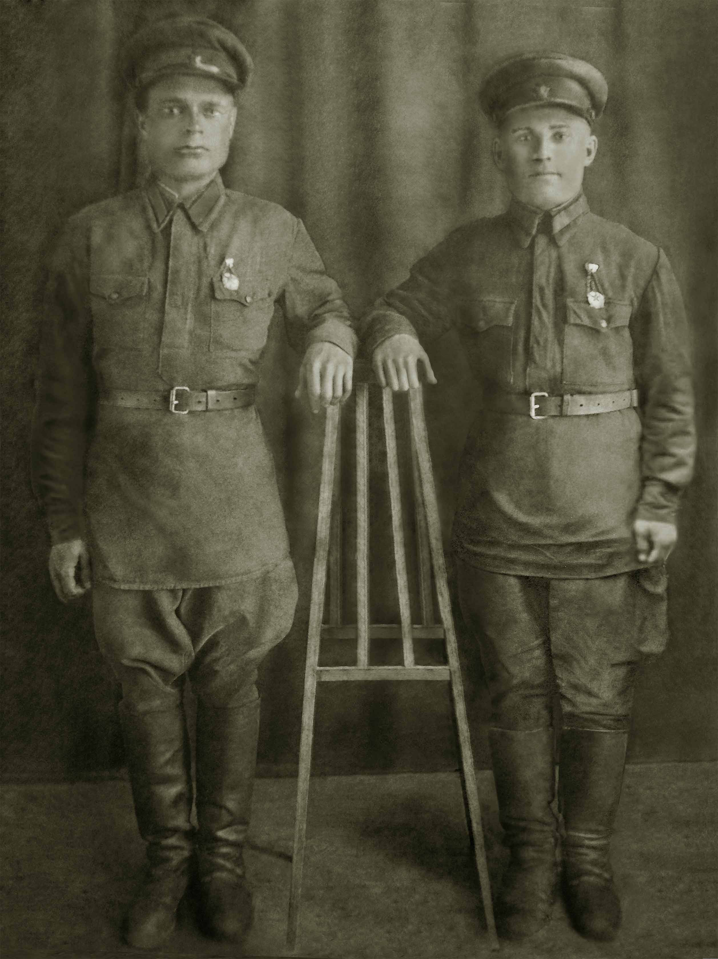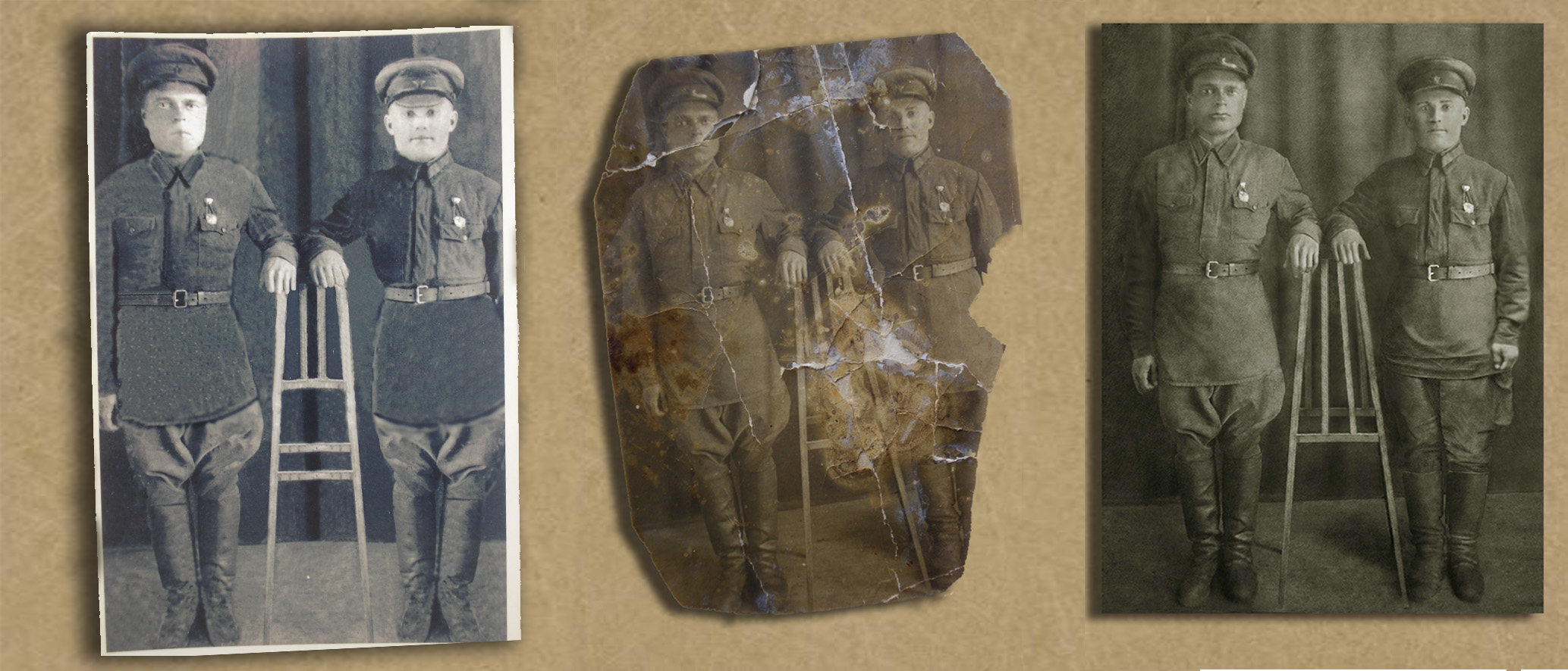Мао, спасибо за отзыв! Работать с Вашим фото было одно удовольствие. Нравятся сложные снимки, простая ретушь конечно тоже иногда бывает интересна, потому что верхний слой фотографий в разных условиях повреждается и распадается по разному, соответственно и подход к восстановлению разный, приходится голову поломать как лучше его привести в надлежащий вид. Бывает фото вроде целое, без потерь, но вся поверхность либо испещрена точками, или сеткой трещин или паралельных штрихов, пятен, как на шкуре леопарда.... сидишь часами над этими точечками. А если применить фильтр, к примеру, по удалению шума и царапин, то он съест и сохранившиеся детали родной информации - блики в глазах, рельеф на пуговицах, медалях и прочем и все станет ровным - прафиновым.... Поэтому и делаю все ручками, чтоб максимально сохранить всю деталировку снимка.