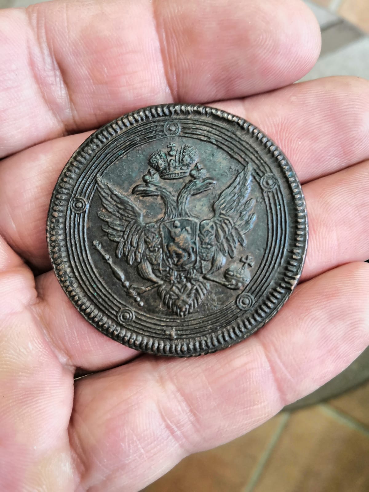 Интересная история обретения этого сувенира. Утром позвонил мне знакомый (к копу и нумизматики отношения не имеет) и спросил сколько стоит рубль Петровский.. я ему не глядя сказал что рублей 100. он не успокоился и сказав что рубль точно из земли, предложил взять меня в долю.. только за монетой нужно съездить за 30км.. я сказал что мне ничего не надо и чудес не бывает. отказал ему. К обеду товарищ рубль привёз.. и поведал историю его находки... накануне он улетел на своей восьмёрке в кювет, и пропахал в кювете машиной землю.. на следующий день протрезвев нашёл на своей распашке глазами рубль. Вот что бы он успокоился, я и выставил его на определение... не помогло.. повёз рубль сегодня в город в антикварный магазин сдавать. |