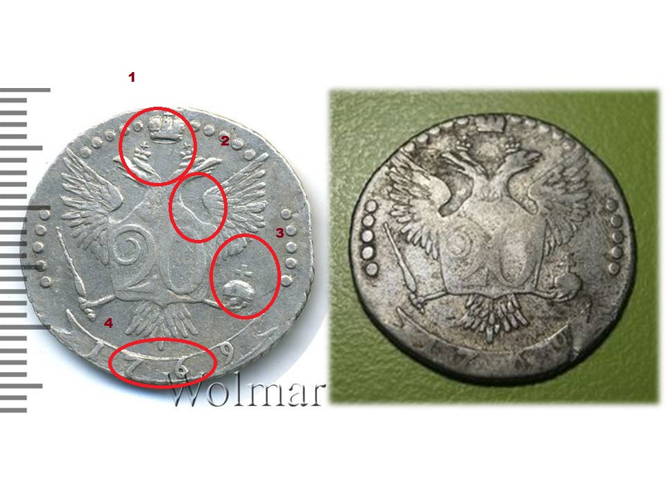 Кругами на монете с волмара пометил те места, которые бросились в глаза и показались подозрительными у предлагаемой 20 копеек 1769 года ММД Спасибо Вложенные эскизы изображений -------------------- Если деньги мерить кучками, то у меня ямки