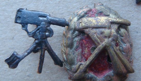 Пулеметная эмблема в приказе на 1924г. а знаки КрасКом актуальны до 1922г.,потому думается что РККА пользовала эмблемы царского периода на знаки. Но на твоем знаке командира звена,отделения явно не царев пулемет. Фото бы глянуть 24г. с петличными эмблемами |