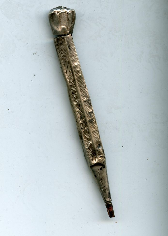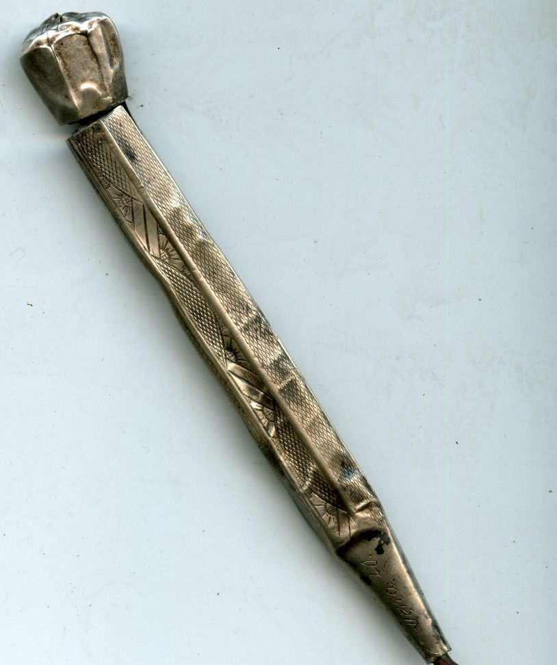 QUOTE(Андрефт @ Aug 13 2015, 15:09) попался карандаш тоже побывавший в огне. Пишет по сей день. Ваш карандаш в серебре ( тонкая оплетка серебра на медной основе как правило) ...Где-то должна быть там и проба. У меня подобный ,гравировка -Vien 40 - правда не пишет ...так же побывал в переплете Вложенные эскизы изображений -------------------- Каждая сосна - своему бору шумит...
