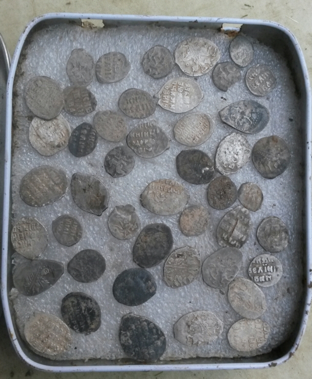 Копали всего до 15-00, другу нужно было ехать на ДР. Сложились ,идём домой! Я прибор не убрал, говорю выкопаю один цветной сигнал и всё, быстрым шагои к машине! Сигнал ,копаю-чешуя...и понеслось! Пришлось задержаться часа на 1,5. Думаем кошель, но не исключаем ,что и кладуха!!! Шурфанули участоу всего метр на два 41 монетка Вложенные эскизы изображений |