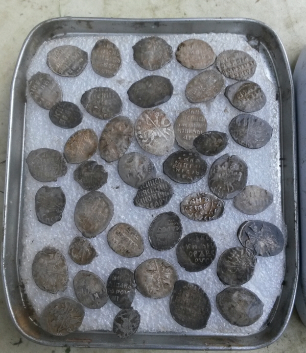 Посетили место находки! Заложили шурф в одно из направлений от эпицентра,где кучкой лежало 100 монет. Тяжкий труд ,доложу я Вам! Удалось вырубить, по другому не скажешь, ещё 45 монет .Наибольшая концентрация была между корней большой берёзы , примо под ней. Что с ней делать ума не приложим!
