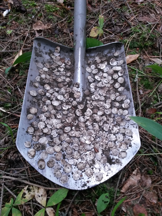 Не успел ещё отойти от первой в жизни кладухи, как судьба преподнесла новый сюрприз! Да похлеще первого!! Отправились мы всё с тем же другом на разведку нового места, позже ещё два комрада присоеденились( надеюсь отпишут в теме и фоток добавят, я всего два снимка на телефон сделал) Мы с Костей выдвинулись в 5 утра, протопали ни один км практически без результатно, к 11 навстречу нам шло подкрепление Так вот встретились мы волею судьбы на месте, где и провели весь оставшийся день! На очередном не многосленном цветном сигнале делаю копок, прим в ямке вижу лежит чешуйка, достал её, и вижу в ямке лежит ещё кольцо! Начинаю его вытаскивать, трудно поддаётся, потом оп,вынул , и понимаю,что в руках не кольцо, а ГОРЛЫШКО ОТ КУБЫШКИ!! Сразу всё понял!!! И мой радостный крик разорвал лесную тишину!!! Выкапывать не стал, созвал друзей! Далее были песни,танцы с бубнами и прочая радость!! Ну а потом дрожащей рукой начали извлекать на свет божий! Вложенные эскизы изображений |