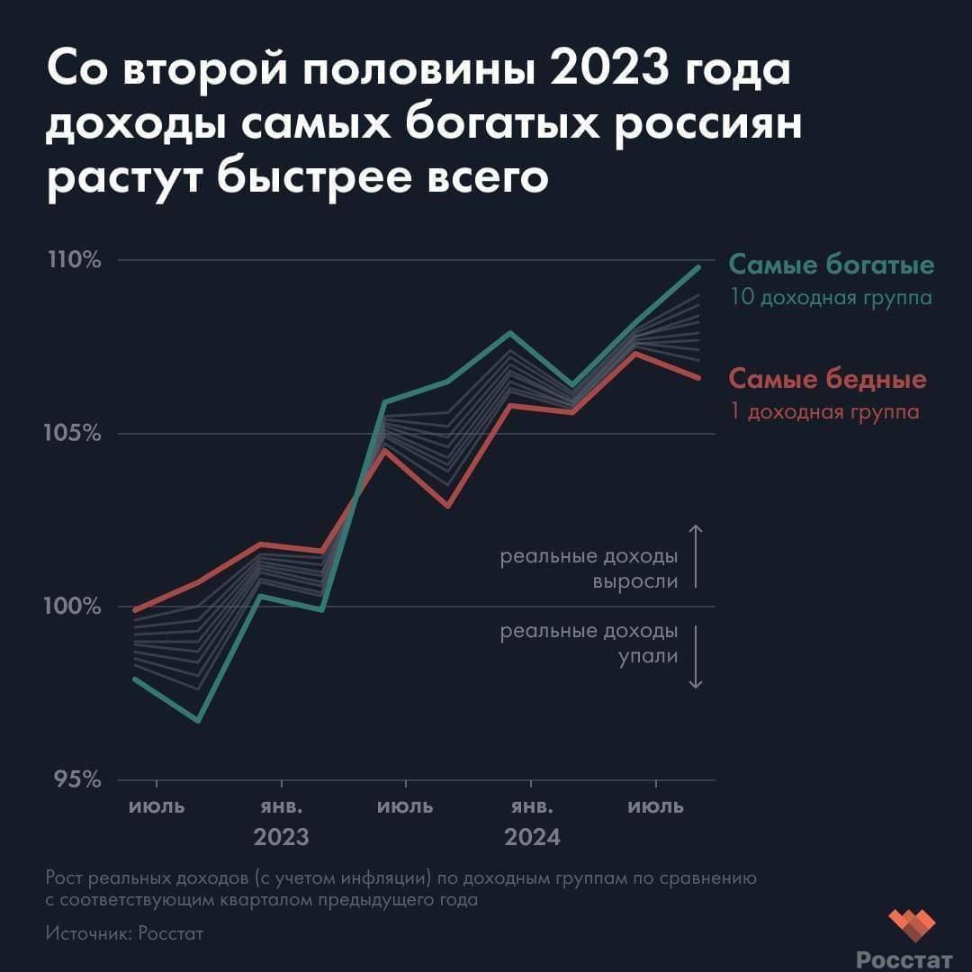 QUOTE(НикК @ Jan 18 2025, 18:50) А вот факты: "О вхождении России в четверку крупнейших экономик мира" "Пересмотренные в 2024 году данные показали, что Россия поднялась на 4-е место в мировом рейтинге экономик по ВВП ППС. Это показатель отображает эффективность, с которой страны используют имеющиеся у них экономические ресурсы для создания богатства и улучшения уровня жизни своих граждан." QUOTE(TKS @ Jan 18 2025, 12:54) "По данным Росстата, в России наблюдается тенденция, при которой богатые становятся еще богаче, а бедные — беднее. ➖ Разрыв между доходами богатых и бедных россиян достиг впечатляющей отметки в 1500%, что является историческим максимумом. Средний доход наиболее обеспеченных составляет 185 300 рублей, тогда как самые малоимущие имеют доход лишь 11 900 рублей." Сообщение отредактировано TKS: Jan 18 2025, 16:35 -------------------- tomsktks@yandex.ru