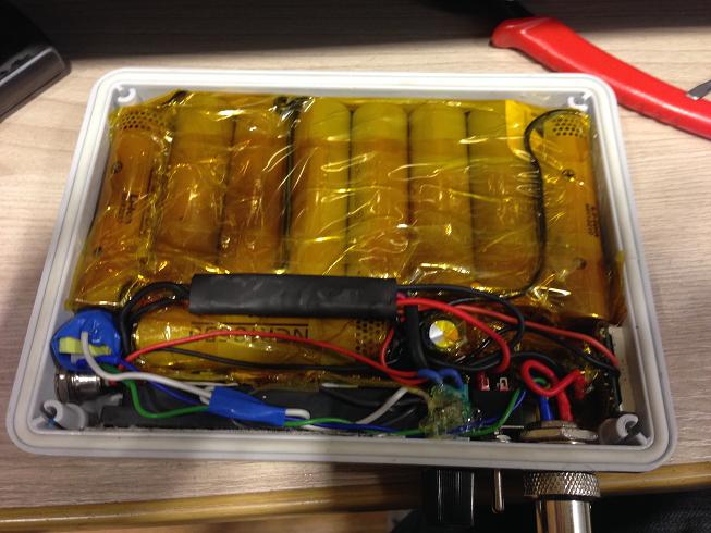 Для GP сделал батарею в гермобоксе. Плату контроллера дополнительно облил лаком и закатал герметично в клеевую термоусадку. Правда там ещё впихнуть пришлось много всего в корпус: динамик, усилитель, регулятор громкости, преобразователь, фильтры, двухуровневая защита, вольтметр (т.к. батарея пилотная, проходила полевые испытания и прогоны на столе, требовался контроль параметров). Монтаж получился плотный, аудио разъём не влез. Зато даже динамик не боится грязи и воды :-)