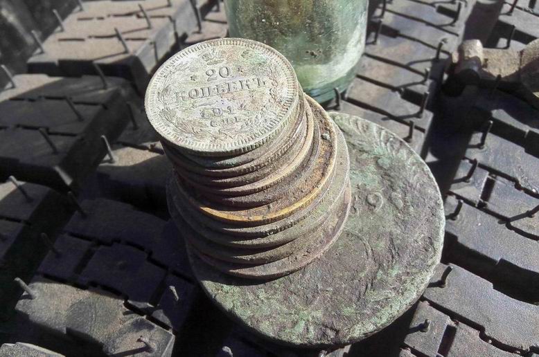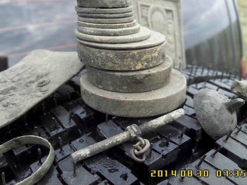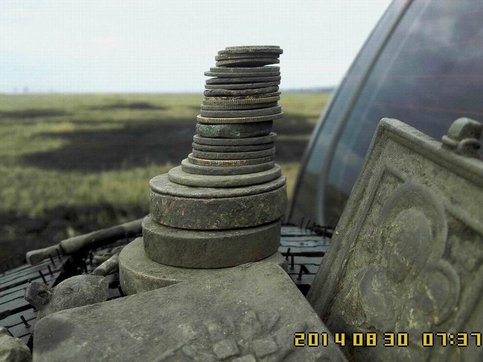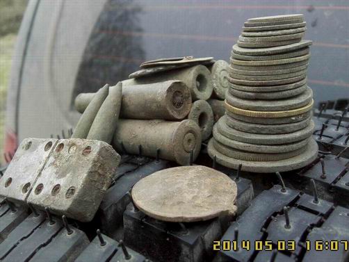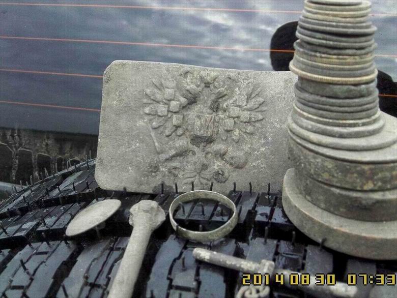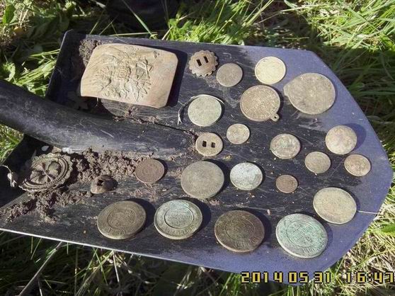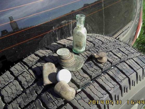 Воскресенье, 01.06.2014, 12:25:28 Выезд ** Давно я поездками своими не хвастал, отчетов не выкладывал! А, сопссно, и выкладывать то нечего было - все позарывал, все запасы монет кончились. Все! Нету у меня больше монет и артефахтов сторических. Нету! Расствор мыльный, для чистки монет, в чаны да тазики залитый - засох весь совсем!. Я его обратно на куски мыльные порезал. Было мыло хозяйственное, таперича - мыло "Какалик" с запахом медных кружочков. Никому не надо? Недорого уступлю! Мыльце шибко в чернокопательском деле пользительное! Встаете, такие, поздно-поздно ночью. Физиономию свою, малость сном помятую, да ручоны треморные, мылом этим мажете. Побольше, да погущще - не жадитесь! Чать, для себя - любимого... И ни в коем случае не смывать!!! Смысл данного деяния таков : 1. Пахнете вы теперь миазмами монетными, так что Дедушка земляной вас теперь за самую ближнюю родню признает! Внучком ли или внучкой ,сынком или дочкой. Тут в зависимости от полу и возраста... По-родственному столько хабару отсыпет - задеретесь собирать! 2. Да и запахом чужим вы теперь монету не спугнете - пахнете то вы теперь не табаком и портвешком, как прощелыга какой городской. Пахнете вы теперь как павловский двундель, а местами - как сам пятак катериновский! Монета теперь вас не боится - на глубину от вас и катухи вашей чуткой не уйдет. 3. Через часик в полях, морду вашу обмыленную, толстым слоем комарья,слепней и мух покроет. А еще пылью и мусором всяким! Ну там, листва прошлогодняя, мышиные гнезда, какушки всякие... Такая морда лица станет - ммммм! В самой злобной чувашской деревне, прям в центре, кереметь ихнюю сможете копать. Бес-пре-пят-ствен-но! Чан чаваши вас за Керемета примут и деньги вам сами понесут. Так что сильно напрягаться и не надо будет - ездий себе, с туром по чувашским деревням да монетос в мешки собирай! Вона сколько причин купить мыльце мое. Народ! Налетай не скупись - покупай живо... хм... Мыло, карочь, берите! Первому покупателю бесплатно! В обмен - рассказ об чудодейсвенном действии препарата! Сам то препарат не опробывал - как то времени все нету. Чет загнался. Сдается мне, это была минутка рекламы! О чем я .... А вот. Вопщем, монетосы кончились - чаны монетные пересохли, коробки с под обуви, в коих монеты лежали, пусты. Сквозняк, на монетных альбомах, странички пустые переворачивает, листами шелестит... Все тлен... Как теперь быть, что зарывать? Чем же теперь отечественную археологию поддерживать??? Беда... Но мы ж старые копаря! Хош и бымвшие! По карманам обмундирования своего ветхого, погодными невзгодами источенного, полазили - нет ничего! Ой бедааа! Пришлось детекторы включать, да с ними ветошь свою чернокопательскую проверять. Чуть копнули-шурфанули и находочки пошли-потянулись... А что - имеем все права! Культурному слою то и десяти лет нету! Хабар собрали и рванули его закапывать! По традиции, перед тем как отпустить монетос на волю - памятное фото. Монет мало - пришлось разбавить чуть-чуть сопуткой. Напарник мой, в этот раз, переборов свою природную скромность, тоже решил сфотать на память свои закопушки. Щирокой души человечищще! Такой хабар закопал - аж завидно! Особенно жаба душила за прягу артилеристскую! Такую он прягу прикопал. Ээх! Сохран чудеснейший - фото обратки нету, но там, даже железная шпилька для ремня сохранилась. В поля приехали,а там как в песне: - ТРАВАААА ПО ПОООЯС.... Еле-е