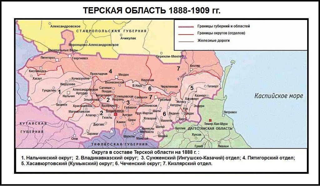 Станицы Терских казаков К 1917 году территория Терских казаков состояла из полковых отделов: Пятигорского, Кизлярского, Сунженского, Моздокского, а горная часть делилась на округа: Нальчикский, Владикавказский, Веденский, Грозненский, Назрановский и Хасав-Юртовский. Областной центр во Владикавказе, центры отделов в Пятигорске, Моздоке, Кизляре и станице Старосунженской. Кизлярский отдел: Центр отдела г. Кизляр Александрийская у станицы было 20 хуторов. Александро-Невская у станицы было 3 хутора. Петропавловская Дубовская — (Пугачёв, Емельян Иванович — некоторое время был приписан к этой станице) у станицы было 4 хутора. Бороздиновская у станицы было 9 хуторов. Каргалинская (она же Каргинская)- (Пугачёв, Емельян Иванович — был приписан к станице затем был выбран атаманом Терского Семейного войску, затем арестован сторонниками прежнего атамана и отправлен в Моздок) у станицы было 3 хутора. Курдюковская у станицы было 3 хутора. Старогладовская (в XIX веке жил граф Л. Н. Толстой, сохранился дом) у станицы было 3 хутора. Гребенская у станицы было 3 хутора. Шелковская у станицы был 1 хутор. Старощедринская у станицы было 7 хуторов. Червлённая (в XIX веке жил М. Ю. Лермонтов, Л. Н. Толстой, Дюма) у станицы было 8 хуторов. Николаевская у станицы было 8 хуторов. Моздокский отдел: Центр отдела г. Моздок Калиновская у станицы было 29 хуторов. Савельевская Мекенская Наурская Ищерская (Пугачёв, Емельян Иванович — проживал в 1772 г.; Сафонов, Илья Иванович (1825—1896) — казачий генерал, герой Кавказской войны; Сафонов, Василий Ильич (1852—1918) — знаменитый дирижёр, пианист, директор Москавской консерватории; Книпер, Анна Васильевна (1893—1975) — последняя жена адмирала Колчака; Ложкин Николай — атаман станицы, предательски убит чеченцами в 2003 г.) Галюгаевская Стодеревская Котляревская Александровская Луковская Новоосетиновская Черноярская Павлодольская Терская Сунженский отдел: Центр отдела ст. Слепцовская Грозненская (включена в г. Грозный) у станицы был 1 хутор (Мамакаевский)(совр. Первомайская станица) Ильиновская Петропавловская Ермоловская (совр. Алханкала) Барятинская (совр. Горячеисточнинская) у станицы был 1 хутор. Кахановская (первоначально Умаханюртовская) — уничтожена в 1917 г. Романовская (совр. Закан-Юрт) (первоначально Заканюртовская) Самашкинская, совр. Самашки Михайловская Серноводская Слепцовская (б. Сунженская), совр. Орджоникидзевская Троицкая Карабулакская (совр. город Карабулак) Вознесенская (первоначально Магомедюртовская) Ассиновская Нестеровская Фельдмаршальская (совр. Алхасты) Промежуточная (Куртат) Воронцово-Дашковская (Комгарон) Сунженская (Сунжа) Камбилеевская (Октябрьское) Камбилеевская (упразднена) Змейская Николаевская Ардонская (совр. Ардон), хутор Ардонский (совр. поселок Мичурино) Архонская Тарская (Тарское) Пятигорский отдел: Центр отдела г. Пятигорск Александрийская Александровская Бекешевская Боргустанская Георгиевская Горячеводская Государственная (совр. Советская) Екатеринградская Ессентукская Зольская Кисловодская Курская Лысогорская Марьинская Незлобная Подгорная Приближная Прохладная Новопавловская Незлобная Старопавловская Солдатская В марте 1920 декретом Всероссийского ЦИКа Терская область была расформирована, а Чеченский (объединённый с Ичкерийским) и Ингушский (объединённый с Нагорным) округа стали самостоят