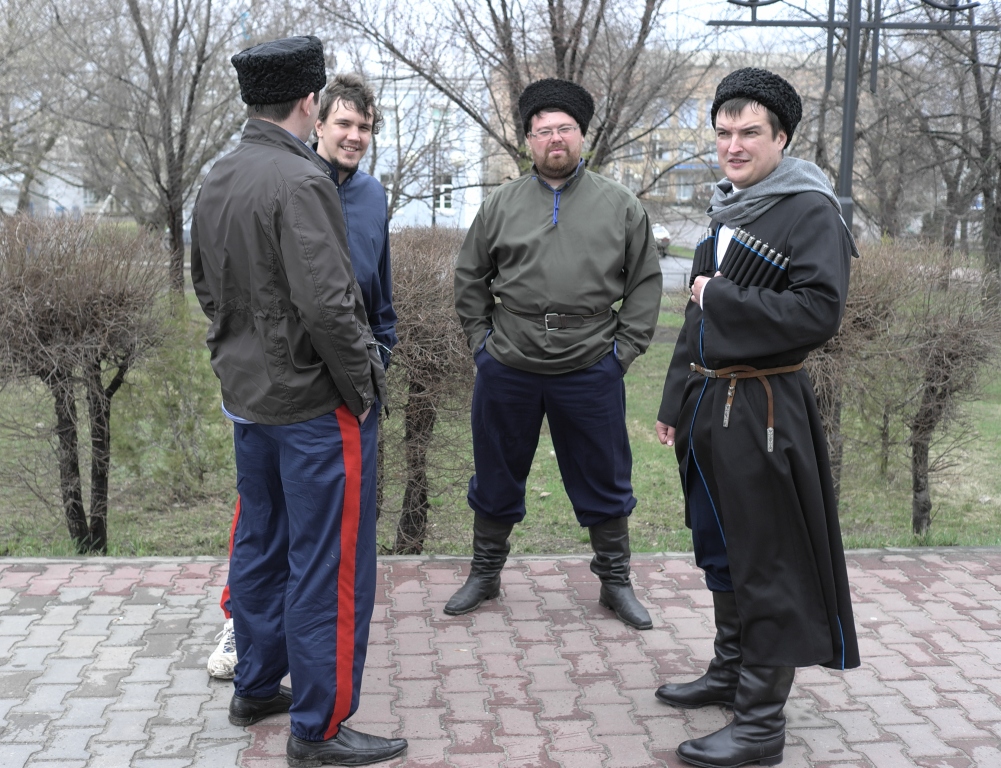 Вот,обычные казаки.Ни погон,ни крестов.Только подчёркивающие отношение к казачеству атрибуты,надетые по поводу празднования крестин ребёнка.Парень в черкеске-гость с Кубани,тоже казак. Что плохого в том,что люди просто чтут свои традиции?Кого это может раздражать? Вложенные эскизы изображений -------------------- А ты что,рассчитывал здесь увидеть живого епископа?!