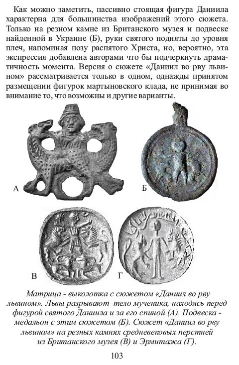 В своей книге "Первые боги славян" я подробно разбираю предположение О. А. Щегловой о том, что композиция из фигурки "человекольва" и двух львов из "Мартыновского клада" является изображением сюжета "Даниил во рву львином". Там же приводятся и примеры иконографии этого сюжета. Думаю что в данном случае атрибуция этой иконки правильна. А изображение львов, композиционно очень близкое к сюжету "Полет Александра", просто видение автора. Да и львы начинают "терзание" с ног святого. На фото страницы из книги видно, что такой вариант позы святого (с распростертыми руками) существовал.