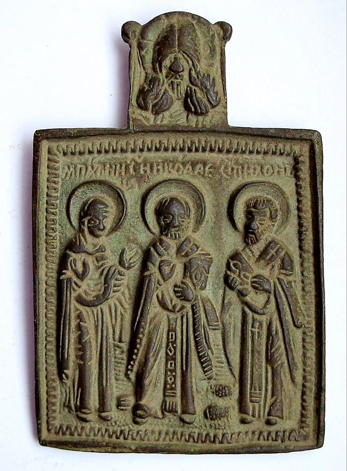 ": атрибутируйте святых, пожалуйста, коллеги: https://imageup.ru/img186/5057017/50kh30.jpg.html Заранее признателен." Думаю, что это святые Николай, Параскева и Тихон. Сюжет был почитаем старообрядцами. Возможно как раз с этой иконы и взяли идею сюжета. Только в более поздней версии 18 века Параскева стоит не в центре, а слева. Вложенные эскизы изображений -------------------- Никуда не летаю, ничего не копаю !