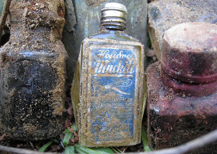 Это под Тосно.Жидкость от комаров,как новая,геранью так сильно пахла что чуть из дома не выгнали.У фашистов все на совесть.Чернила красные применить можно по назначению.