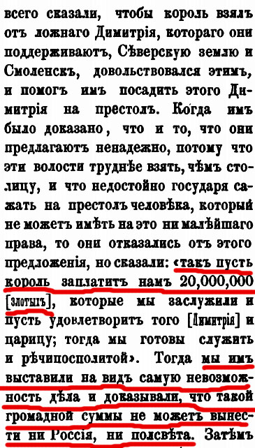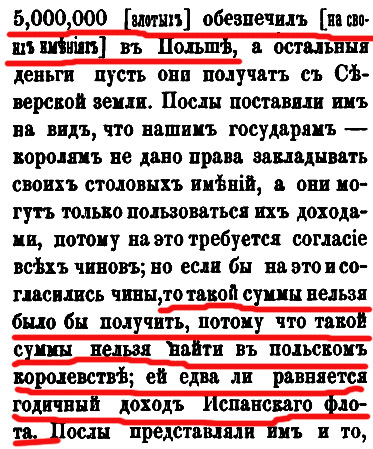 QUOTE(GrandMa @ Dec 8 2016, 17:31) Где- то читала, что доход Радзивиллов был 20 млн золотых... в год, больше чем во всей Речи Посполитой. Ну это так просто... К делу не относится... Косвенно относится, это говорит о размерах сумм в то время, поэтому такая информация всегда полезна. Ниже я дам тоже один пример, с суммами. Тоже показательный. QUOTE Вы забываете, что обоз был в 1000 телег! Ещё раз повторяю - не берите вы за основу кладовые записи, которые опубликовали поздние авторы в развлекательных книжках. Тем более, что сами уже признали, что явно там мешанина, а не конкретика, особенно в тех местах, которые друг от друга в разных записях отличаются. Это художественный вымысел, не более. Советую оперировать архивными документами, они тоже не истина в последней инстанции, но им хотя бы относительно можно доверять. Неужели же ни в одном документе не сохранилось сведений о таком огромном обозе? Тысячи телег, десятки тысяч сопровождающих, сотни тысяч жителей Москвы и по дорогам в свидетелях, но - ни одной записи, нигде и никогда, кроме "кладовой" позднейшей придумки? Не кажется ли это странным? А был ли мальчик? QUOTE А что там было в Московской казне того времени, кто ж знает. Как это никто не знает? А полистать приходно-расходные книги Московского казённого приказа? Там вполне доступно показаны расходы и доходы, с суммами, и на их основе можно представить себе порядки цифр, и зная денежную систему того времени, можно привязываться к приблизительным объёмам оборота, как по суммам, так и по количеству монеты. QUOTE Вот и я удивляюсь откуда столько то, если что бы расплатиться с польскими солдатами Вполне справедливое удивление. Уверяю вас, что если бы это было бы правдой, то польские солдаты, несомненно, в количестве нескольких тысяч (а иначе как сохранить в неприкосновенности 1000 телег с золотом?!), не меньше вашего были бы удивлены, если на их глазах их жалование (или добыча) внезапно была бы закопана, а не роздана им в качестве жалования (награды). Сильно подозреваю, что в итоге возникшего на этом основании бунта закопали бы короля, а не золото. QUOTE Упоминается закладка в 8 бочек Королоевского положения, в каждой по 7 млн злата... Вот, а вот тут - обещанный пример. Пара страничек из книжки. Как раз про обсуждаемый период времени, Сигизмунда и объёмы денежных сумм. Сообщение отредактировано DevaD: Dec 8 2016, 17:24 -------------------- У меня есть любимый цветок С зубами как тысячи спиц И если бы не горшок Он мог бы ловить даже птиц