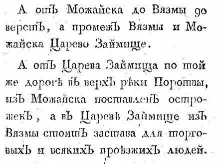 Царствующей град Москва стоит на реке на Москве на левом берегу. А в реку в Москву, с вышней стороны города Кремля, пала речка Неглинна, течет сквозь Белой город; а ниже Белаго города в реку Москву пала речка Яуза. А река Москва вытекла по Вяземской дороге за Можайском верст с 30 и больше. А от царствующего града Москвы дорогою до Можайска 90 верст, а город Можаеск стоит на реке на Москве на правом берегу. На реке ж на Москве, ниже Можайска 50 верст, а от Москвы 40 верст, на левом берегу Звенигород. А от Можайска до Вязьмы 80 верст, а город Вязьма стоит на реке на Вязьме на левом берегу. А река Вязьма вытекла выше города Вязьмы 20 верст и пала река Вязьма в Днепр от города от Вязьмы верст с 30. А от Вязьмы до Дорогобужи 80 верст, а город Дорогобуж стоит на реке на Днепре на левом берегу. А река Днепр вытекла изо мшары из болота от Белые от города 60 верст, а от города от Вязьмы 60 верст, а Белая от Вязьмы 120 верст. А от Дорого-бужы до Смоленска 80 верст. Смоленеск на Днепре с левые стороны. А река Днепр, и которыя реки в Днепр пали, и по Днепру городы на низ, и пороги, и горы мильми и верстами писаны собе сгатьею. А промеж города Можайска и города Вязьмы по Московской, дороге верх реки Поротвы, от Можайска 30 верст, для заставы из Можайска острожок, в нем стоит застава смотреть у проезжих людей от воевод проезжих грамот и печатей, а у торговых людей смотреть товаров. По той же дороге село Царева Займище, а в нем стоит застава из Вязьмы смотреть тож, а Царева Займища от Вязьмы 40 верст.