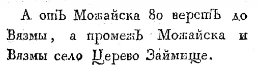 QUOTE(runas @ Mar 11 2019, 13:46) всего то 80 верст между вязьмой и можайском А откуда эта цитата-то? Источник? Если что, то в публикации от 1792 года "в типографии Горнаго училища" вообще нет привязки Царёва Займища ни к чему вообще. Да ещё расстояние от Можая до Вязьмы указано не в 80, а в 90 вёрст, что уже ближе к правде... Да, ещё в этой же книжке есть такое место, что, с одной стороны, немного не совпадает с первым утверждением (хотя оно ближе к реальности), но с другой стороны всё одно не указывает точное расстояние до Царёва Займища: Сообщение отредактировано DevaD: Mar 11 2019, 13:34 -------------------- У меня есть любимый цветок С зубами как тысячи спиц И если бы не горшок Он мог бы ловить даже птиц