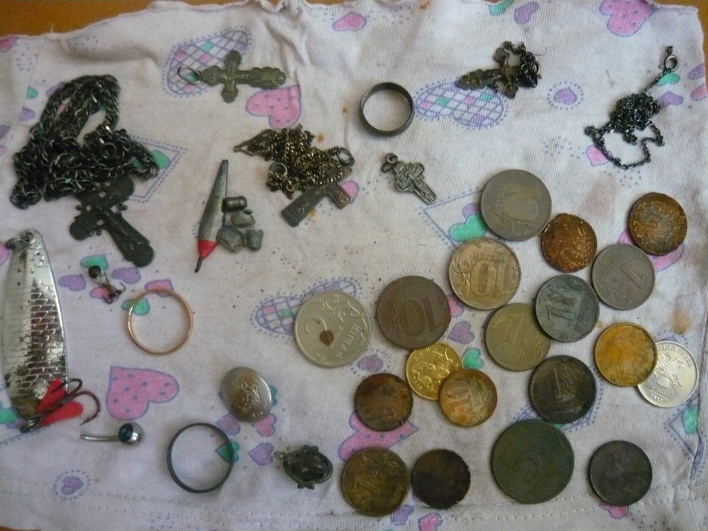 На все том же любимом месте! Последняя добивка. Дальше нужен акваланг, которого нет. Рыжье выцепил на цыпочках по горло при росте 192, благо брат помог выкопать сигнал, прибор подержал, так бы не достал! Сильвер сверху, снизу бижуха. Штук шесть пулек от пневматики отрыл, на фото только одна попала.