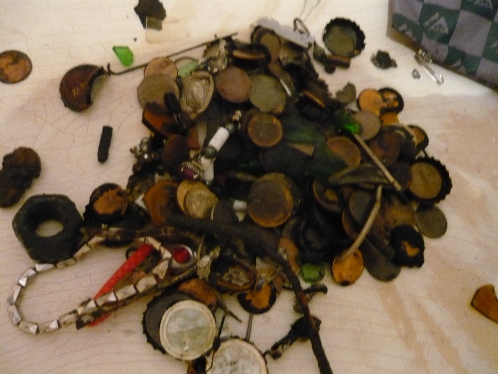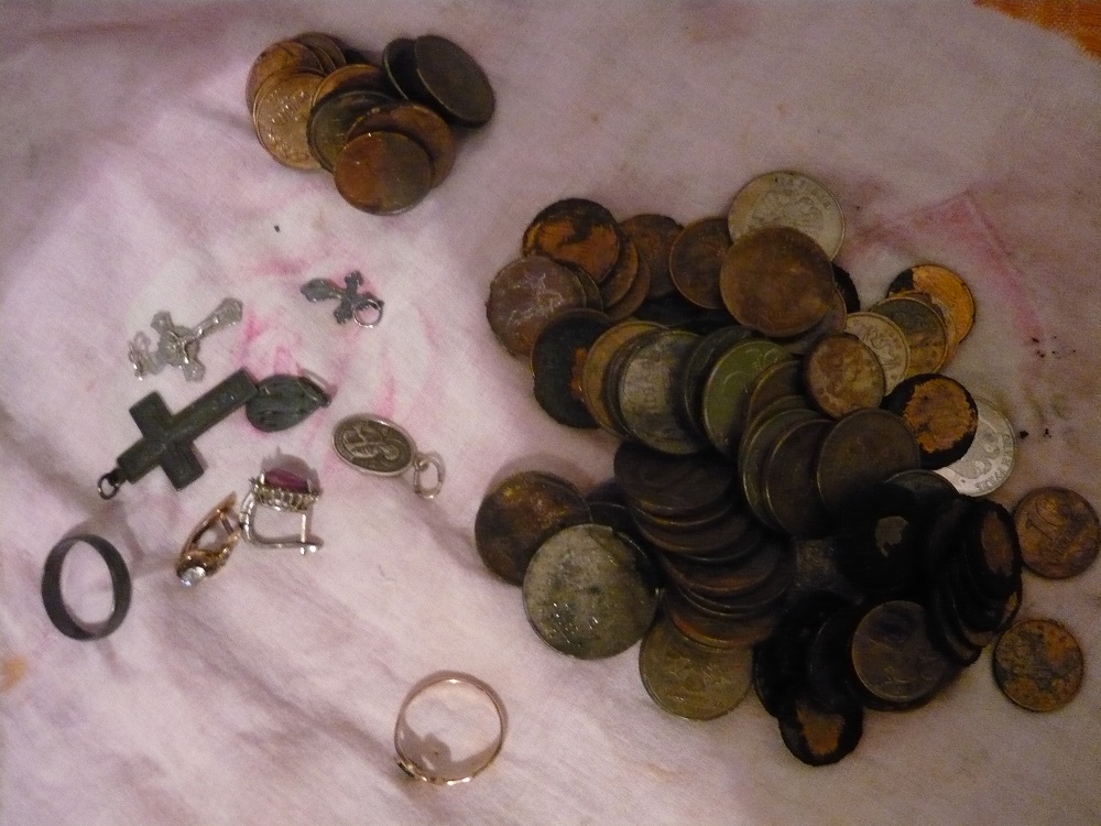 Вчерашний день был совсем глухой: 50 руб убитой мелочи призатратах более 1500 руб только на бензин. Сегодня решил на центральный поехать с братом. Приезжаем в 4 утра, а там уже камрад берег чистит! И вот результат по воде ( по суше не выкладываю): одно правильное колечко, серебра немного (серьга серебряная позолоченная), мелочи почти 200 руб и кучка молодой России с советами, ну и куча хлама как всегда. Лебеди порадовали, это диво дивное для наших краев, жаль пока за фотиком бегали они далеко отплыли!