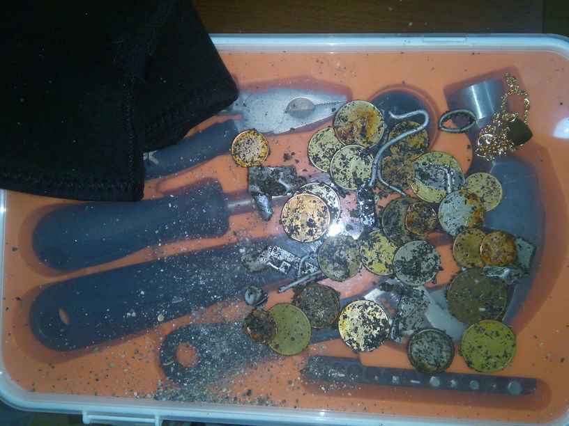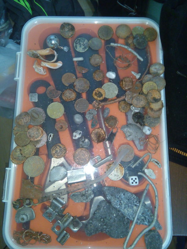 Всем привет. Кратковременный циклон принёс на наше побережье достаточно внушительный шторм и беспечно было не воспользоваться этим подарком. Итог почти за 6ч поиска. В ассортименте весь пляжный набор.Перстенёк попался с семистрельной иконой.Пробы нет,но стоит именник 8ХЧП. Кольцо имеет лимонный оттенок,позже к ювелиру забегу...Всем удачи