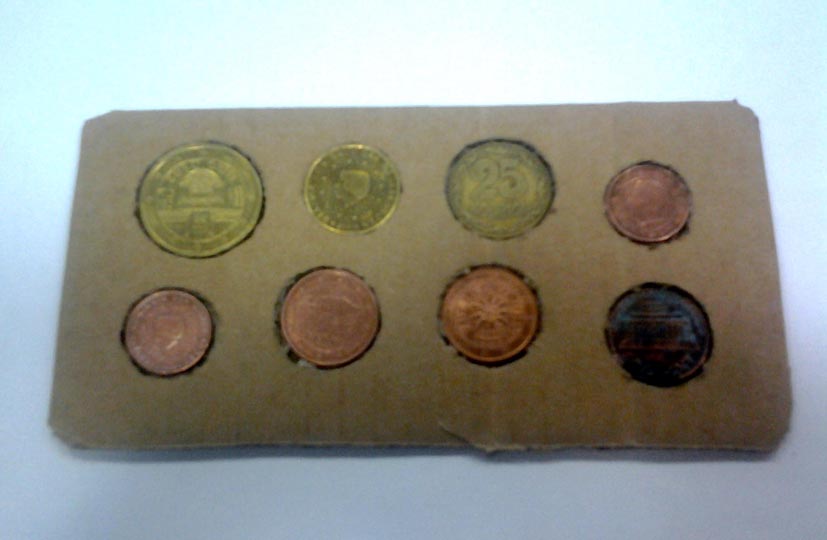 А я не вырезаю ничего в картоне. Кладу монетки между двумя листами картона и заматываю скотчем. Если монет много - то надо несколько этажей картона делать, иначе подозрительно будет на почте - слишком большой вес для заказного с бумажными вложениями.