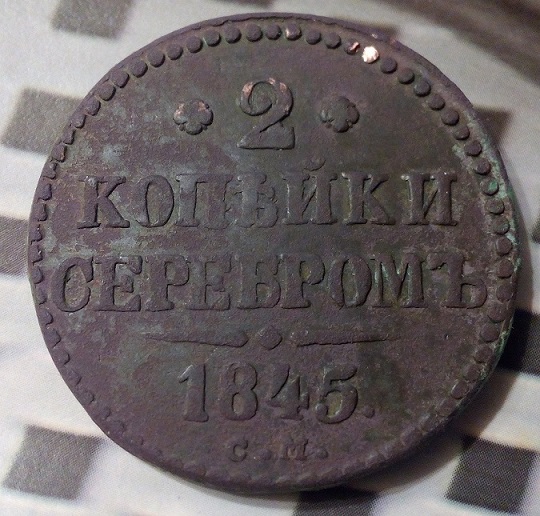 Неделю назад был на копе. Старая деревня,умершая после войны и давно распаханная,и конечно порядком выбитая. На таких местах стараюсь копать все сигналы,а не только спорные. После некоторого времени ловлю первый сигнал,очень спорный, копаю на полштыка,выскакивает двушка Екатерины 2. Был удивлен, сигнал далеко не цветной был. Кладу ее рядом с ямкой, начинаю водить катушкой. Никакого намека на медь не слышу. Идет сигнал ,как на железный окислившийся осколок от снаряда. Сначала подумал, что катушке кранты. Отношу монету от ямы на метр, пробую снова. Появляется четкий высокий цветной сигнал. Пробую снова над ямкой, идут какие то хриплые сигналы. Углубился еще штыка на два ничего.Думаю какое то железо внизу ,забивало цветной сигнал. Аппарат терра 705,катушка коилтек 18,75.