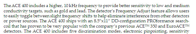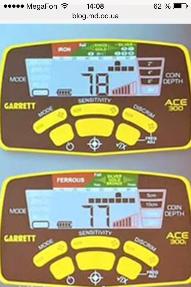 Озвучка железа (Iron Audio), как у АТ ПРО и Голд, будет только у АСЕ 400. Частота прибора 10 кГц. Катушка 8,5х11. АСЕ 300 с катушкой 7х10 и частотой 8 кГц. АСЕ 200 с катушкой 6,5х9, частота 6,5 кГц. Цена установлена в 400, 300 и 200 долларов за прибор (у них).