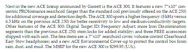 Озвучка железа (Iron Audio), как у АТ ПРО и Голд, будет только у АСЕ 400. Частота прибора 10 кГц. Катушка 8,5х11. АСЕ 300 с катушкой 7х10 и частотой 8 кГц. АСЕ 200 с катушкой 6,5х9, частота 6,5 кГц. Цена установлена в 400, 300 и 200 долларов за прибор (у них).