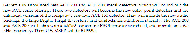 В новой линейке будет аж шесть металлоискателей Garrett ACE 200, ACE 200i, ACE 300, ACE 300i, ACE 400, ACE 400i.