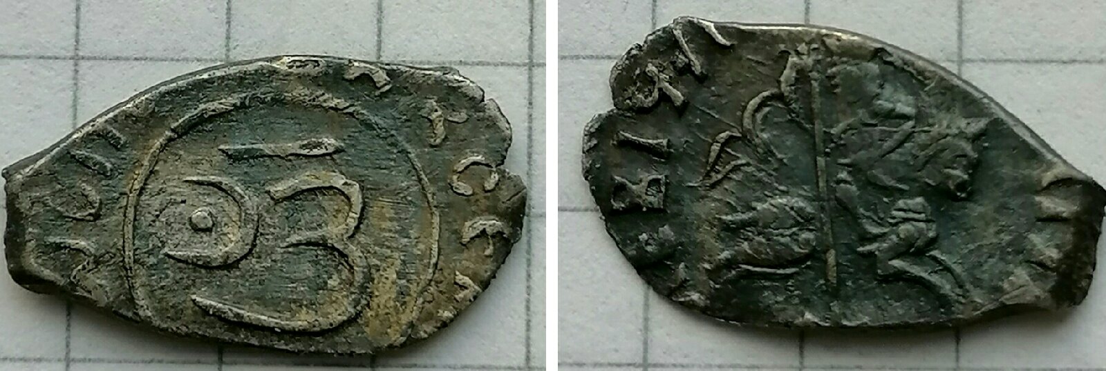 QUOTE(max-gelik @ Nov 30 2020, 18:39) Доброго всем времени! Просьба помочь в определении и оценке данной чешуйки. Похожа на шведскую фальшивку (#222) .Всем ответившим заранее благодарен! Обычная московская копейка. КГ 340, одна из самых частых. -------------------- Продажа бон мира и средневековых монет по фиксу (Орда, чешуя и др.) - смотреть в моих темах.