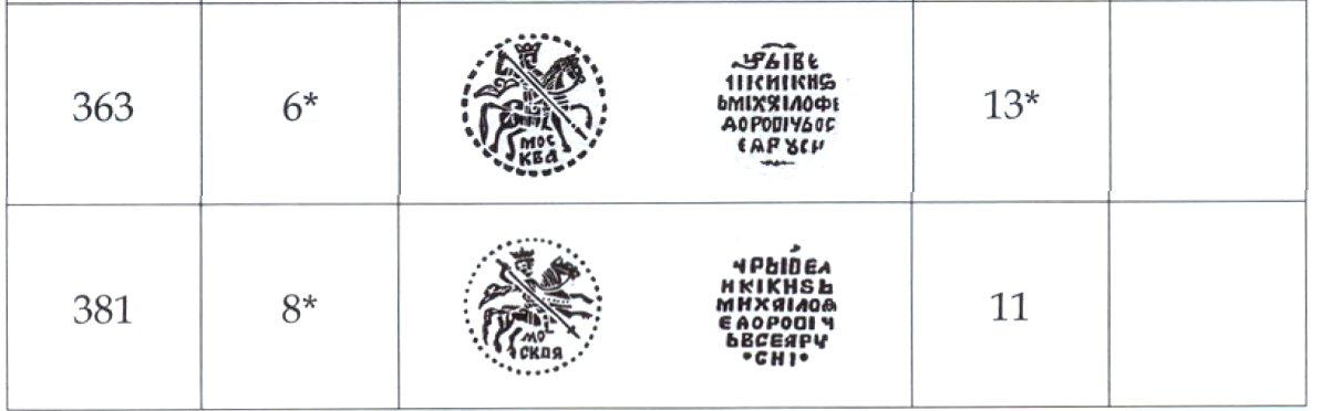 QUOTE(umberto @ Apr 12 2021, 21:04) Доброго всем здравия. Затруднился с определением 2х монет Михаила Федоровича по ГК. Прошу помощи в определении каталожного номера и по возможности оценки. Моё почтение. 1. КГ340, ГКХ363 2. КГ367, ГКХ381 -------------------- Куплю комплексы чешуи 3х рублевой монетной стопы (от Ивана Грозного)