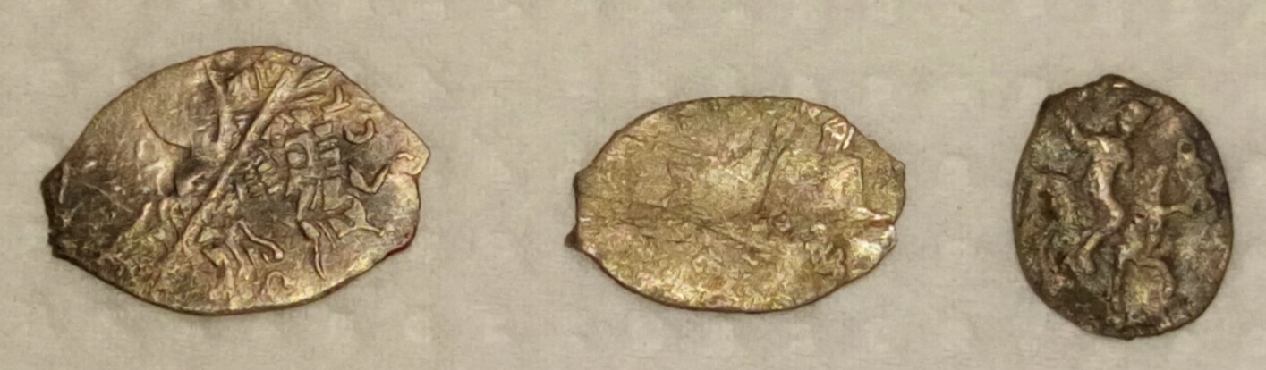 Впервые встретил грозную денгу, с крупным изображением всадника, который не уместился бы в поле монеты, даже если бы изображение было отцентрованно. Копейки с мужиком с копьем не вмещающимися в монету - не редкость, а вот на маленькой денге - впервые такое вижу. Не КГ#56 случаем? На всякий - весов нет пока, взвесить нечем. Но по диаметру и толщине аккуратно в размерах обычных рядовых грозных денг, не думаю, что за рамками 0,33-0,35 китайскими весами |
