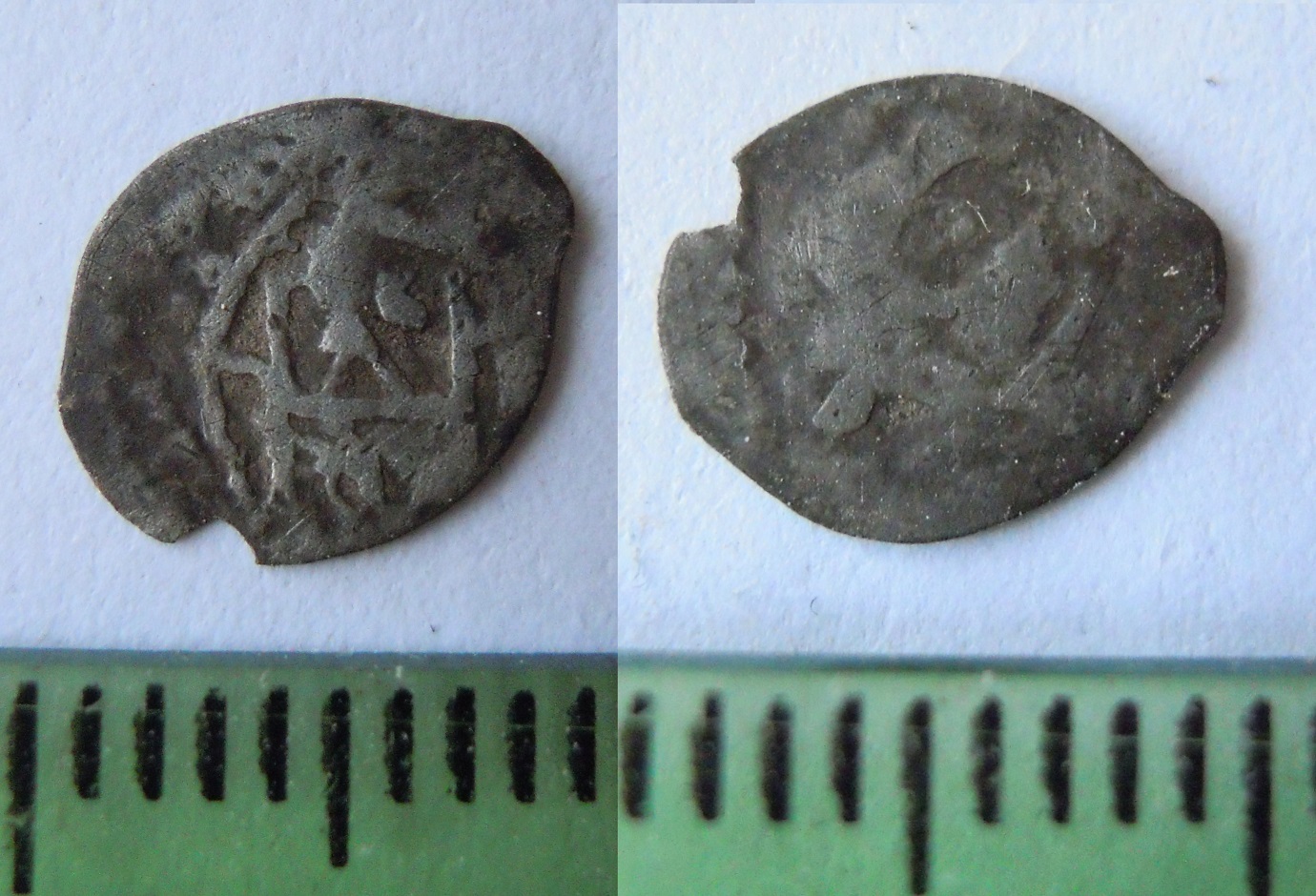 QUOTE(viktor.s @ Oct 8 2021, 21:19) Всех приветствую! Прошу определить монетку. Вес 0,51г Фото с телефона. Денга Великого Новгорода периода независимости (1420-1478г.), пореформенная т.е. чекан после 1447г., 2-го типа (фигура слева сидит). Монета обрезана с целью воровства серебра (в годы хождения), за спиной левой фигуры буква Б. По каталогу Толстого: номер лицевого штемпеля 192, оборотного - 99 (его разновидность). По цене: от 2,5-3 тр. -------------------- При моем выигрыше в аукционе - стучите в лс.