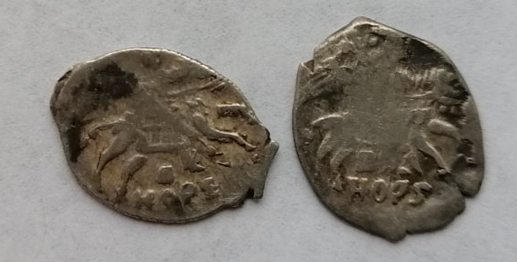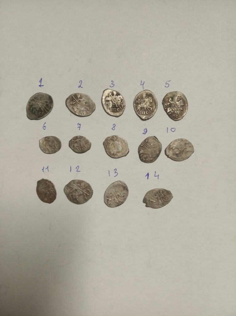 Здравствуйте. Попытался самостоятельно определить и вот что у меня получилось : с первую по седьмую Грозный . У сабельников под конём № 6 то ли д , то ли а . у № 7 iг вроде... 8,9,10 Борис фёдорович , при чём № 10 похоже как перечекан из монеты Грозного. 11 Мих. Фед , (КГ 400 ?) , 12 Шуйский (КГ249 ?) , 13 Лжедмитрий (КГ 244?) и номер 14 я так и не смог понять чьих будет. Не судите строго дилетанта , если есть возможность подскажите по редкости и за одно оцените. С уважением. p/s и ещё : так и не понял сабельники это деньги , или копейки ??