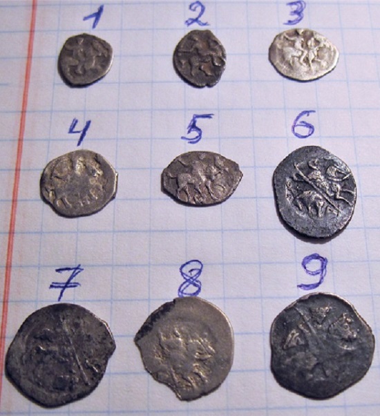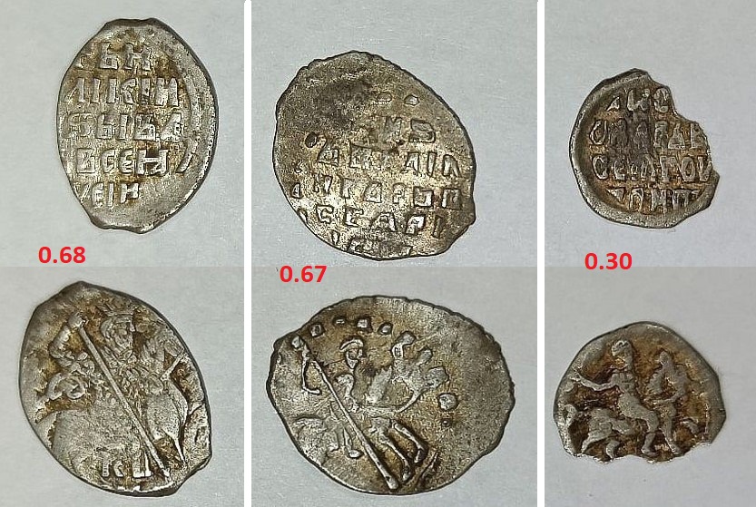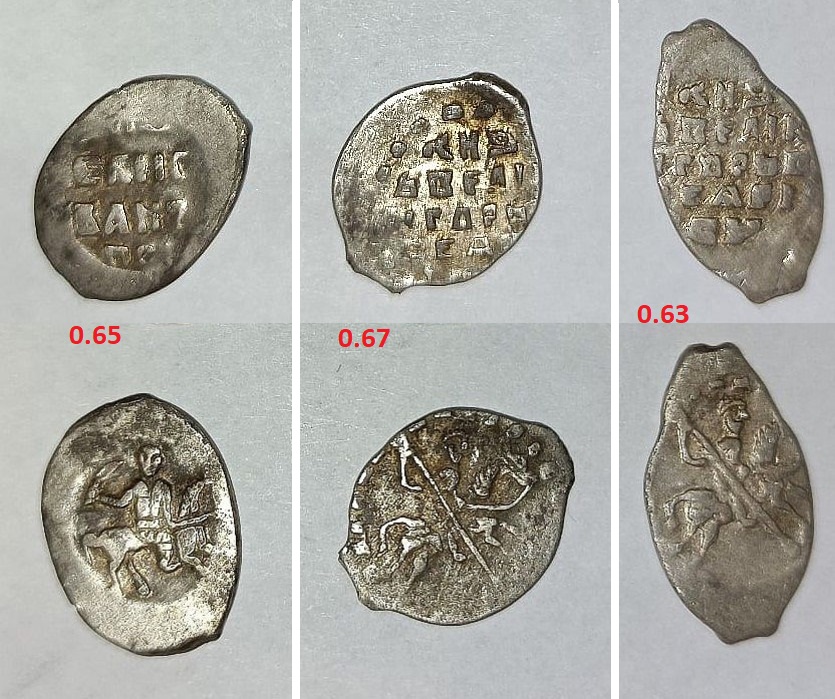 QUOTE(Vasiliy_Tula @ Dec 3 2021, 22:01) 1. Новгородская копеечка Ивана IV Васильевича, КГ 91(19-8), редкость - IX. 2, 5, 6. Новгородские великокняжеские копеечки Ивана IV Васильевича, КГ 75(3-3), рядовые. 3. Тверская денга Ивана IV Васильевича, КГ 65(2-1), рядовая. 4. Московская великокняжеская мечевая копеечка, КГ 73(1-1), рядовая. -------------------- Знаешь - говори, хочешь узнать - слушай