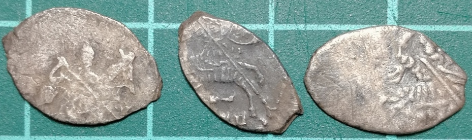 QUOTE(VladimirSkri @ Jan 16 2022, 17:44) Добрый день!Буду благодарен в помощи по определению и оценке данных монет. №1 вес 0,78 гр. с утратой. ![]() ![]() №2 вес 0,77 гр. с утратой. ![]() ![]() №3 вес 0,88 гр. с утратой. ![]() ![]() 1 и 2 Московская денга ВД с барсом. 3 похоже тоже с двойным ударом л/с -------------------- Жду весну. Всегда.