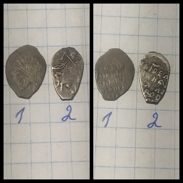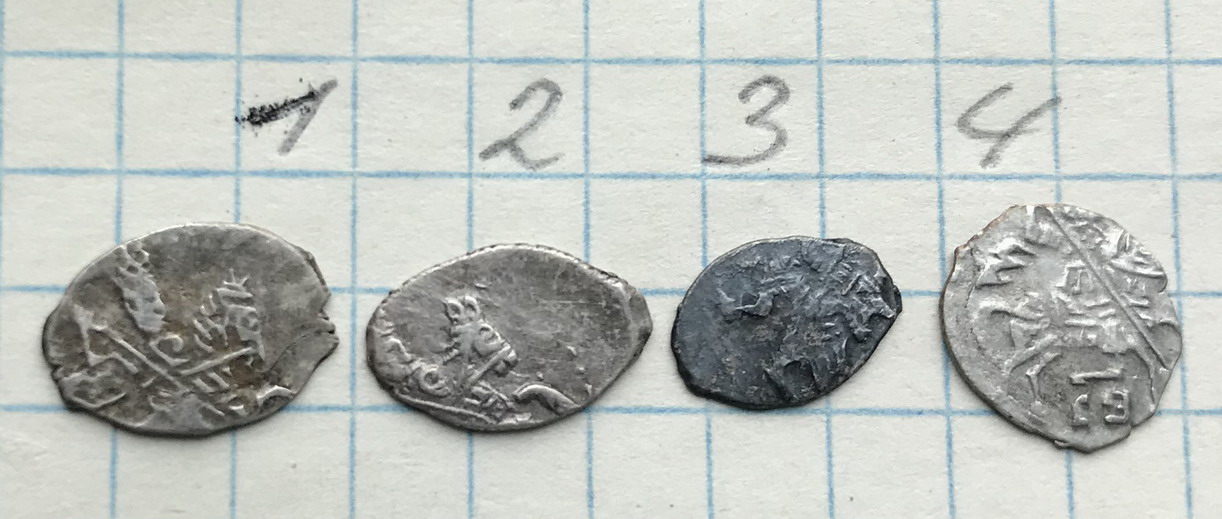 QUOTE(vkurske @ Mar 29 2022, 12:39) 1,2 - Совместное правление Петра и Ивана Алексеевичей; 1 - с именем Ивана, 2 - с именем Петра; 3 - деньга Петра того же периода; 4 - Петр, копейка периода единоличного правления, 1699г. Все простое, деньга немного интереснее прочего. |
