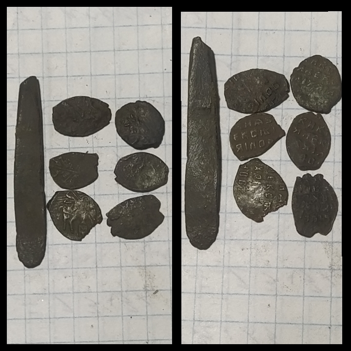 Всем доброго время прошу помощи в определении и оценки монет медных и еще интересно найдена медная проволока расплюшенная таким же цветом и размером рядом с монетами.это что из нее их делали может кто знает ?
