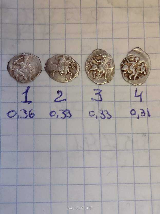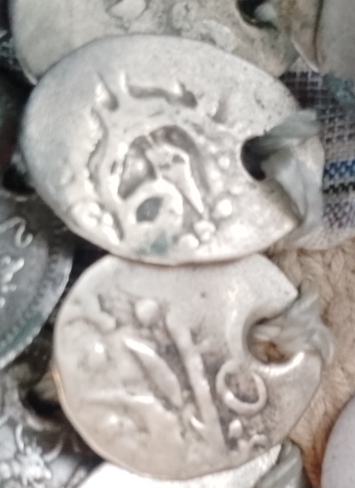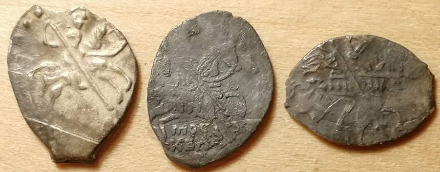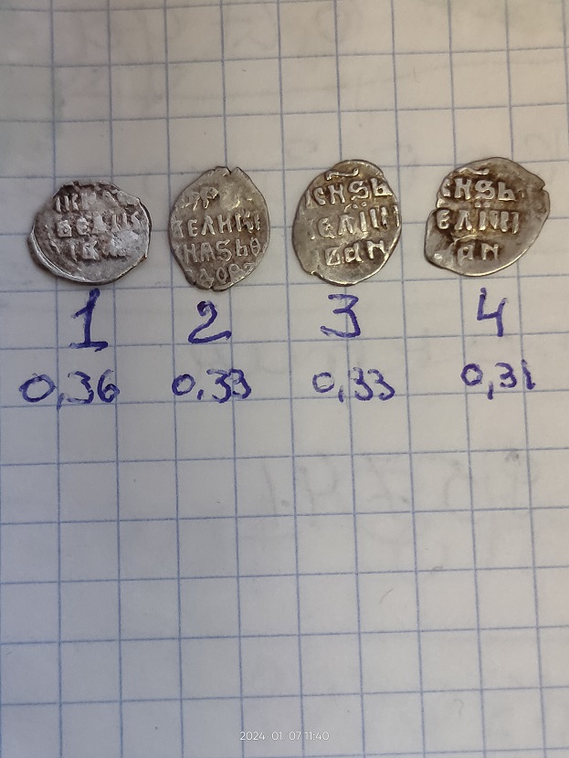 QUOTE(The Black Rider @ Jan 5 2024, 00:44) Надо было умудриться так сделать фото, что б совершенно невозможно было сказать, что где есть что. Новгородская деньга Ивана 3го, копейка Грозного, его же деньга, петровская полушка "врп", копейки Михаила Федоровича, серебряная копейка Алексия и его же медные копейки и пара-тройка чего то нерассмотримого. Спасибо! -------------------- in herbis, in verbis, in lapidibus