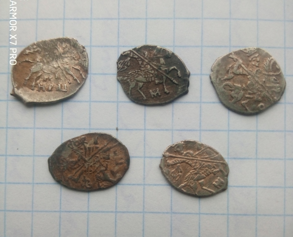 QUOTE(Лигалайз @ Oct 11 2024, 01:27) Просьба определить монеты если кто знает ,спасибо 1 - Юрий Дмитриевич, нижегородская чеканка, сокольник / строчная надпись, ГП-2 № 4554 А, 2 - рубежная денга правления Василия Дмитриевича и Василия Темного с сокольником и Самсоном, чеканка владимирских земель княжества, по ГП-2 № 1700 D (та же пара маточников, но другие штемпели, лицевой штемпель без точек вокруг сокольника). 3 - предположительно, нижегородское пуло начала XV в., но маловато осталось от изображений. Вес можете сообщить? 4, 5 - Алексей Михайлович, медные копейки |