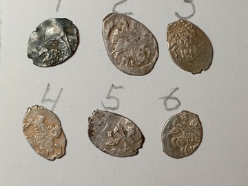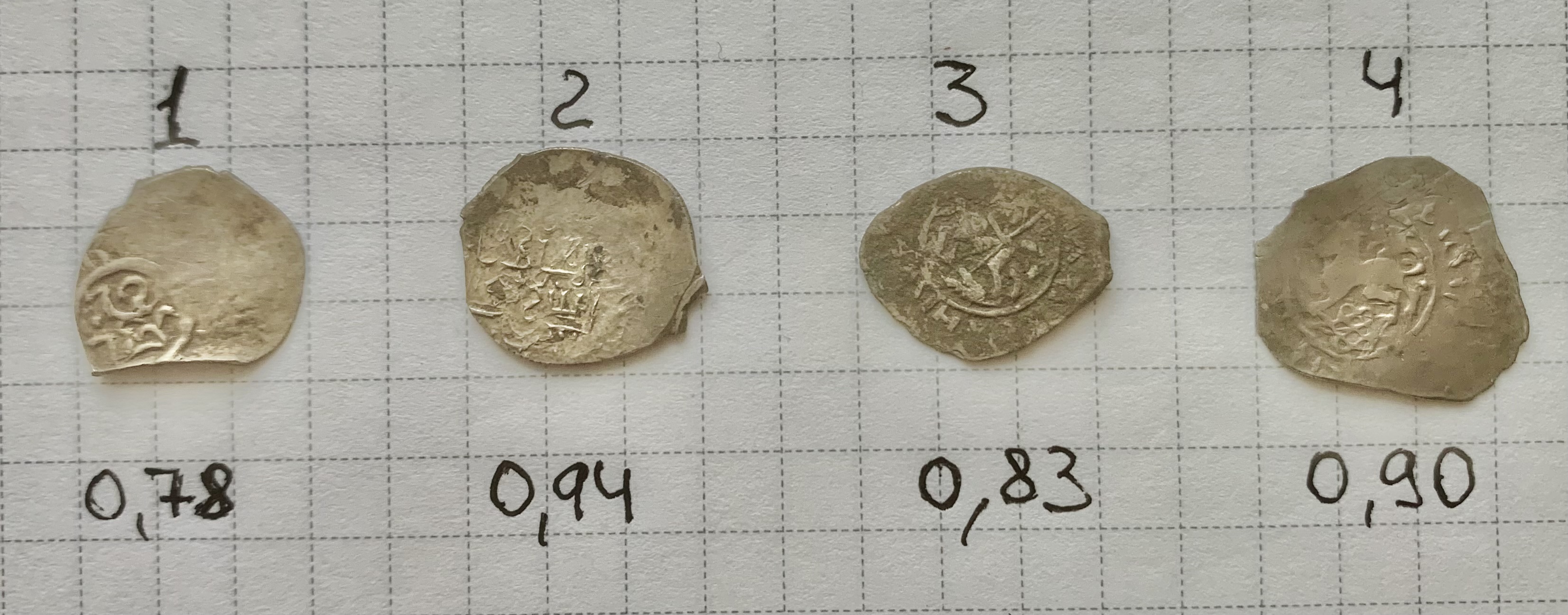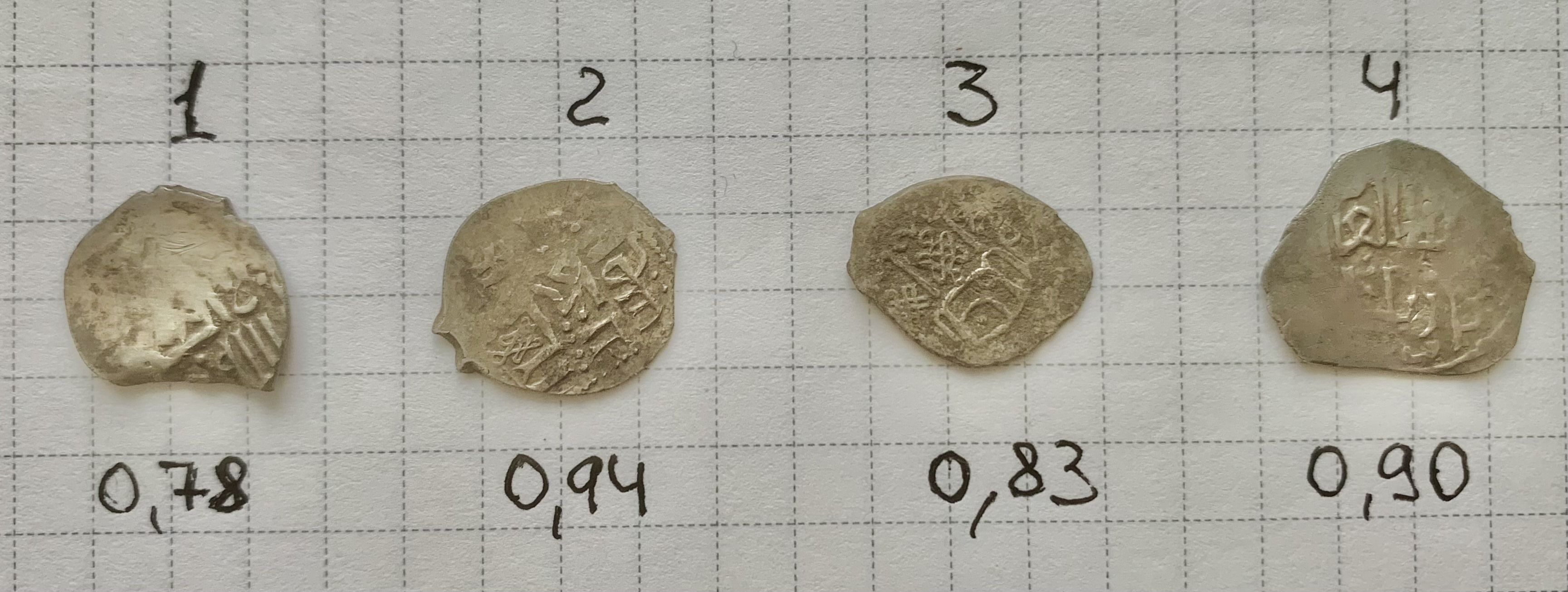 Прошу помощи в определении представленных на фото монет. Предполагаю, что монеты 1, 2, и 3 имеют отношение к Нижегородско-Суздальскому княжеству. Монету под номером 4 ранее определяли как денгу Василия Дмитриевича Кирдяпы (2ГП 4050А), но может будут какие-то замечания? Монеты собираюсь выставить на аукцион, хотелось бы больше информации для оформления заголовков. Заранее спасибо. |