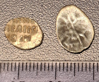 QUOTE(Basik @ Aug 25 2025, 11:01) Всем, доброго времени суток. Прошу знающих людей определить (если это возможно, учитывая состояние монет) эти две чешуйки. Лично мне левая видится как деньга Ивана Грозного, возможно подделка так как по ее поверхности идет посеребрение, а середина монеты видится из другого металла. Правая видится как копейка (просматривается что-то вроде всадника с копьем), только почему то там где должна быть легенда ее нет. Даже намека на то что она была нет. Неужели могла так затереться? Да монетки найдены на Севере МО. Вес левой - 0,3гр, правой - 0,52гр. 1 - московская деньга Грозного КГ 48 ; 2 - инкузный брак псковской копейки Федора Ивановича/Бориса Годунова. ( лицевик, которым отчеканена монета использовался при обоих правлениях). |