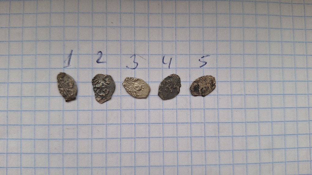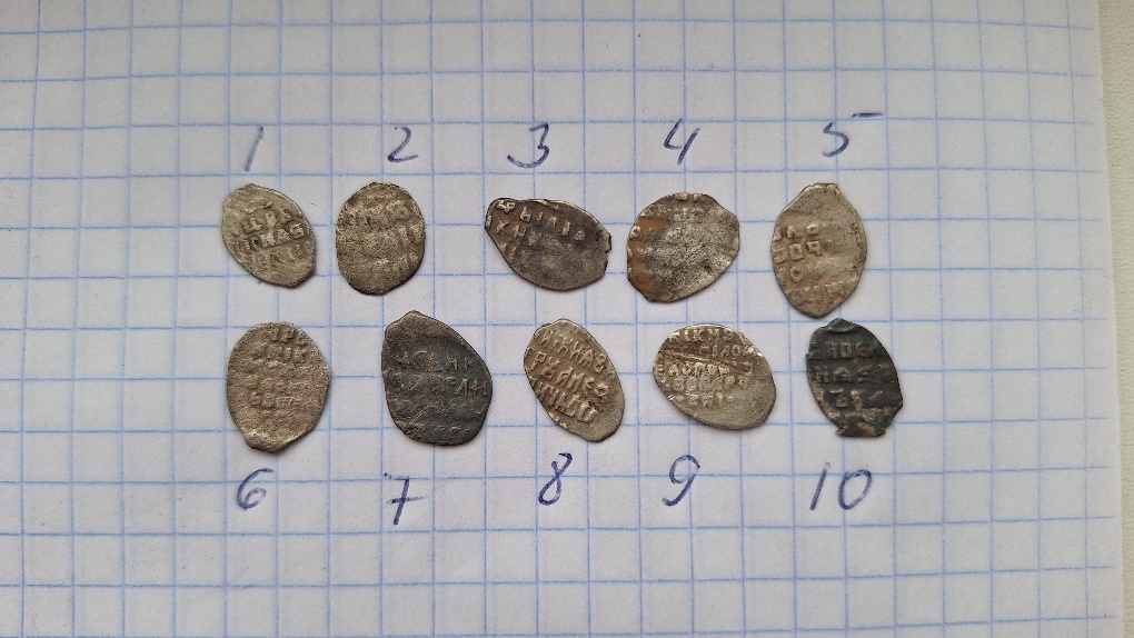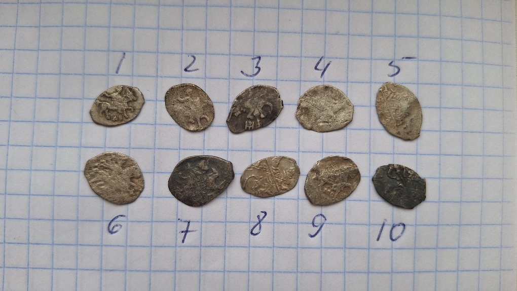 QUOTE(anna&serg @ Oct 28 2025, 16:38) Добрый вечер, помогите, пожалуйста, определить чешую. 1е фото: 1 - не видно ( судя по подписи под монетой, это может быть шведская оккупация Новгорода); 2 - Совместное правление Ивана и Петра Алексеевичей, копейка с именем Петра ; 3,6 - Грозный, т.н. "мечевая копейка", КГ 73 ; 5 - его же новгородская копейка КГ 87 ; 7 - псковская копейка Федора Ивановича КГ 136 ; 8 - плохо видно, вроде бы, новгородская копейка Михаила ; 9 - Борис, московская копейка КГ 173 ; 10 - Михаил, московская копейка КГ 442 ; Фото 2: 1,2 - московские деньги Грозного, КГ 61, 43 ; 3,5,6,9 - московские копейки Михаила , КГ 635, 626, 367, 393 ; 4 - не могу разглядеть; 6 - Федор Иоаннович, псковская копейка КГ 137 ; 7 - Совместное правление Петра и Ивана Алексеевичей, копейка с именем Петра ; 10 - тоже самое, копейка с именем Ивана ; Фото 3: 1 - Петр, копейка Кадашевского двора, 1709-1717гг ; 2,3 - он же, тот же двор, 1701-1709гг ; 4 - денежка Федора Алексеевича ; 5 - совместное правление Ивана и Петра Алексеевичей, с именем Ивана. |